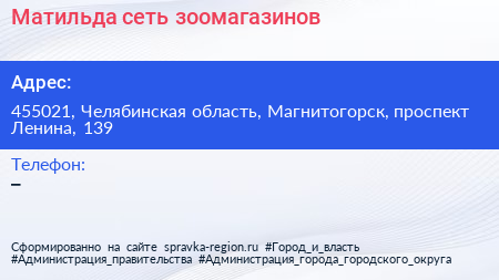 Матильда, сеть зоомагазинов по адресу 455021, Челябинская область, Магнитогорск, проспект Ленина, 139 в дальнейшем Организация, размещена в следующих категориях: