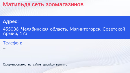 Матильда, сеть зоомагазинов по адресу 455036, Челябинская область, Магнитогорск, Советской Армии, 17а в дальнейшем Организация, размещена в следующих категориях: