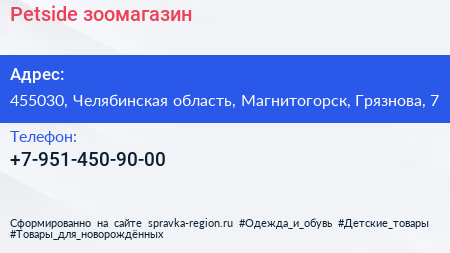 Petside, зоомагазин по адресу 455030, Челябинская область, Магнитогорск, Грязнова, 7 в дальнейшем Организация, размещена в следующих категориях: