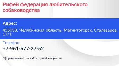 Рифей, федерация любительского собаководства по адресу 455038, Челябинская область, Магнитогорск, Сталеваров, 17/1 в дальнейшем Организация, размещена в следующих категориях: