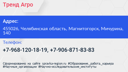 Тренд Агро по адресу 455026, Челябинская область, Магнитогорск, Мичурина, 140 в дальнейшем Организация, размещена в следующих категориях: