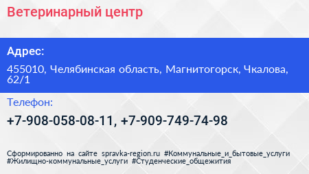 Ветеринарный центр по адресу 455010, Челябинская область, Магнитогорск, Чкалова, 62/1 в дальнейшем Организация, размещена в следующих категориях: