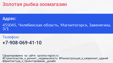 Золотая рыбка, зоомагазин по адресу 455045, Челябинская область, Магнитогорск, Завенягина, 3/1 в дальнейшем Организация, размещена в следующих категориях: