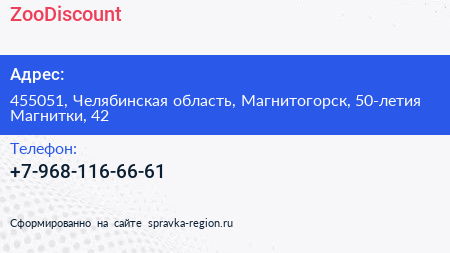 ZooDiscount по адресу 455051, Челябинская область, Магнитогорск, 50-летия Магнитки, 42 в дальнейшем Организация, размещена в следующих категориях: