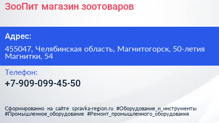 ЗооПит, магазин зоотоваров по адресу 455047, Челябинская область, Магнитогорск, 50-летия Магнитки, 54 в дальнейшем Организация, размещена в следующих категориях:
