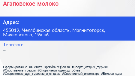 Агаповское молоко по адресу 455019, Челябинская область, Магнитогорск, Маяковского, 19а к6 в дальнейшем Организация, размещена в следующих категориях: