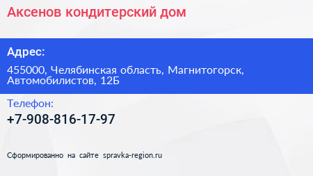 Аксенов, кондитерский дом по адресу 455000, Челябинская область, Магнитогорск, Автомобилистов, 12Б в дальнейшем Организация, размещена в следующих категориях: