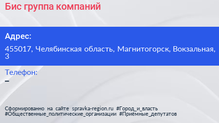 Бис, группа компаний по адресу 455017, Челябинская область, Магнитогорск, Вокзальная, 3 в дальнейшем Организация, размещена в следующих категориях: