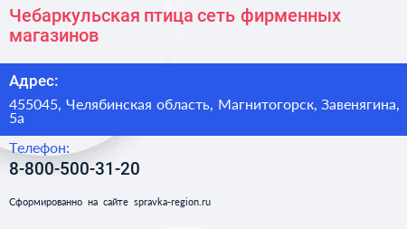 Чебаркульская птица, сеть фирменных магазинов по адресу 455045, Челябинская область, Магнитогорск, Завенягина, 5а в дальнейшем Организация, размещена в следующих категориях: