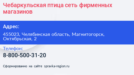 Чебаркульская птица, сеть фирменных магазинов по адресу 455023, Челябинская область, Магнитогорск, Октябрьская, 2 в дальнейшем Организация, размещена в следующих категориях: