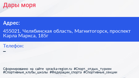 Дары моря по адресу 455021, Челябинская область, Магнитогорск, проспект Карла Маркса, 185г в дальнейшем Организация, размещена в следующих категориях: