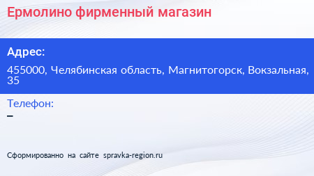 Ермолино, фирменный магазин по адресу 455000, Челябинская область, Магнитогорск, Вокзальная, 35 в дальнейшем Организация, размещена в следующих категориях: