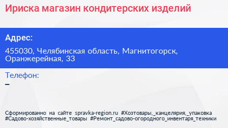 Ириска, магазин кондитерских изделий по адресу 455030, Челябинская область, Магнитогорск, Оранжерейная, 33 в дальнейшем Организация, размещена в следующих категориях: