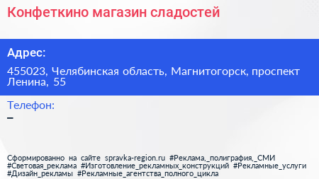 Конфеткино, магазин сладостей по адресу 455023, Челябинская область, Магнитогорск, проспект Ленина, 55 в дальнейшем Организация, размещена в следующих категориях: