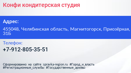 Конфи, кондитерская студия по адресу 455048, Челябинская область, Магнитогорск, Приозёрная, 31Б в дальнейшем Организация, размещена в следующих категориях: