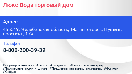 Люкс Вода, торговый дом по адресу 455019, Челябинская область, Магнитогорск, Пушкина проспект, 17а в дальнейшем Организация, размещена в следующих категориях: