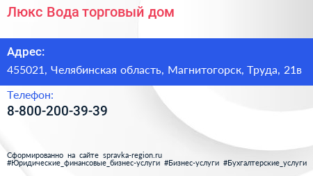 Люкс Вода, торговый дом по адресу 455021, Челябинская область, Магнитогорск, Труда, 21в в дальнейшем Организация, размещена в следующих категориях: