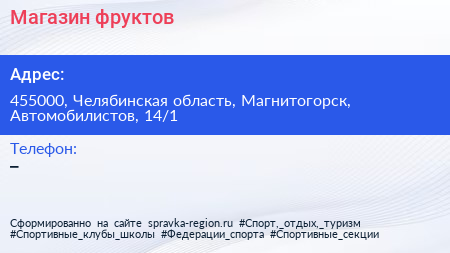Магазин фруктов по адресу 455000, Челябинская область, Магнитогорск, Автомобилистов, 14/1 в дальнейшем Организация, размещена в следующих категориях: