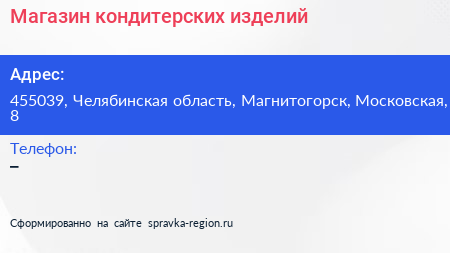 Магазин кондитерских изделий по адресу 455039, Челябинская область, Магнитогорск, Московская, 8 в дальнейшем Организация, размещена в следующих категориях: