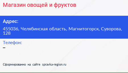 Магазин овощей и фруктов по адресу 455036, Челябинская область, Магнитогорск, Суворова, 128 в дальнейшем Организация, размещена в следующих категориях: