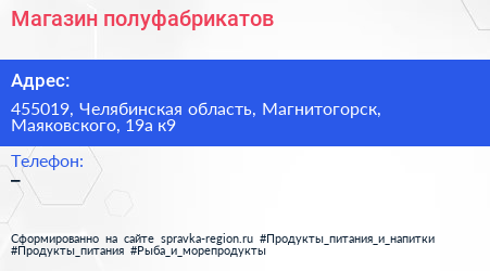 Магазин полуфабрикатов по адресу 455019, Челябинская область, Магнитогорск, Маяковского, 19а к9 в дальнейшем Организация, размещена в следующих категориях: