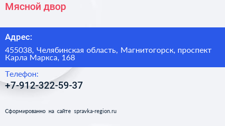 Мясной двор по адресу 455038, Челябинская область, Магнитогорск, проспект Карла Маркса, 168 в дальнейшем Организация, размещена в следующих категориях:
