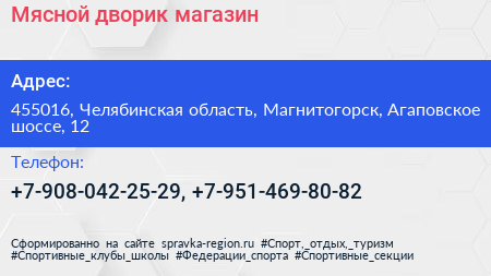 Мясной дворик, магазин по адресу 455016, Челябинская область, Магнитогорск, Агаповское шоссе, 12 в дальнейшем Организация, размещена в следующих категориях: