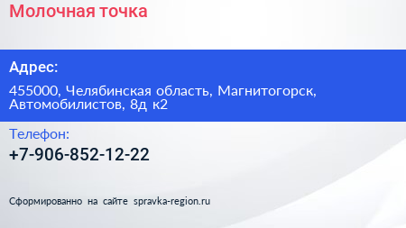 Молочная точка по адресу 455000, Челябинская область, Магнитогорск, Автомобилистов, 8д к2 в дальнейшем Организация, размещена в следующих категориях: