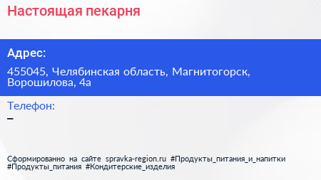 Настоящая пекарня по адресу 455045, Челябинская область, Магнитогорск, Ворошилова, 4а в дальнейшем Организация, размещена в следующих категориях:
