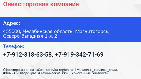Оникс, торговая компания по адресу 455000, Челябинская область, Магнитогорск, Северо-Западная 1-я, 2 в дальнейшем Организация, размещена в следующих категориях: