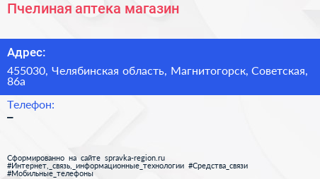 Пчелиная аптека, магазин по адресу 455030, Челябинская область, Магнитогорск, Советская, 86а в дальнейшем Организация, размещена в следующих категориях: