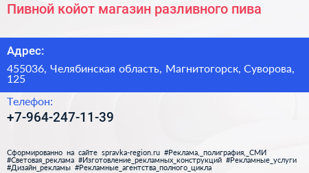 Пивной койот, магазин разливного пива по адресу 455036, Челябинская область, Магнитогорск, Суворова, 125 в дальнейшем Организация, размещена в следующих категориях: