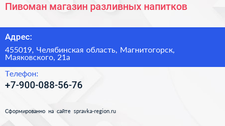 Пивоман, магазин разливных напитков по адресу 455019, Челябинская область, Магнитогорск, Маяковского, 21а в дальнейшем Организация, размещена в следующих категориях: