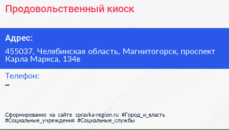 Продовольственный киоск по адресу 455037, Челябинская область, Магнитогорск, проспект Карла Маркса, 134в в дальнейшем Организация, размещена в следующих категориях: