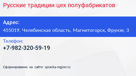 Русские традиции, цех полуфабрикатов по адресу 455019, Челябинская область, Магнитогорск, Фрунзе, 3 в дальнейшем Организация, размещена в следующих категориях: