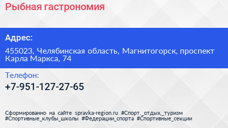 Рыбная гастрономия по адресу 455023, Челябинская область, Магнитогорск, проспект Карла Маркса, 74 в дальнейшем Организация, размещена в следующих категориях: