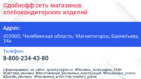 Сдобнофф, сеть магазинов хлебокондитерских изделий по адресу 455005, Челябинская область, Магнитогорск, Бахметьева, 14а в дальнейшем Организация, размещена в следующих категориях: