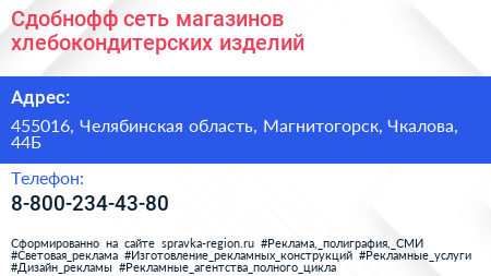 Сдобнофф, сеть магазинов хлебокондитерских изделий по адресу 455016, Челябинская область, Магнитогорск, Чкалова, 44Б в дальнейшем Организация, размещена в следующих категориях: