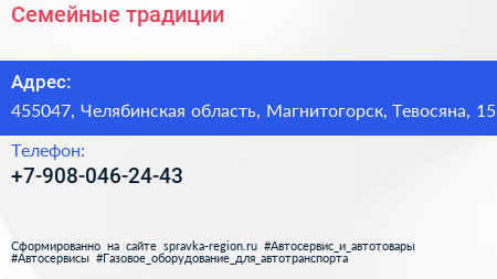 Семейные традиции по адресу 455047, Челябинская область, Магнитогорск, Тевосяна, 15 в дальнейшем Организация, размещена в следующих категориях:
