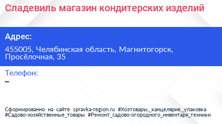 Сладевиль, магазин кондитерских изделий по адресу 455005, Челябинская область, Магнитогорск, Просёлочная, 35 в дальнейшем Организация, размещена в следующих категориях: