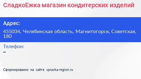 СладкоЕжка, магазин кондитерских изделий по адресу 455034, Челябинская область, Магнитогорск, Советская, 180 в дальнейшем Организация, размещена в следующих категориях: