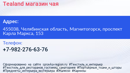 Tealand, магазин чая по адресу 455038, Челябинская область, Магнитогорск, проспект Карла Маркса, 153 в дальнейшем Организация, размещена в следующих категориях: