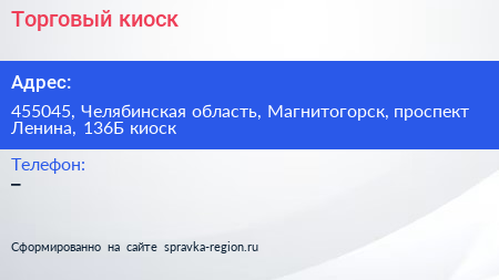 Торговый киоск по адресу 455045, Челябинская область, Магнитогорск, проспект Ленина, 136Б киоск в дальнейшем Организация, размещена в следующих категориях: