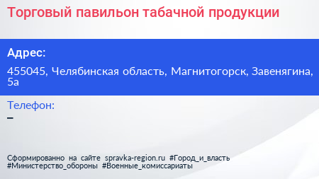 Торговый павильон табачной продукции по адресу 455045, Челябинская область, Магнитогорск, Завенягина, 5а в дальнейшем Организация, размещена в следующих категориях: