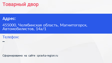 Товарный двор по адресу 455000, Челябинская область, Магнитогорск, Автомобилистов, 14а/1 в дальнейшем Организация, размещена в следующих категориях: