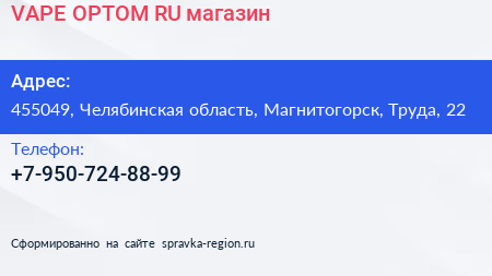 VAPE-OPTOM.RU, магазин по адресу 455049, Челябинская область, Магнитогорск, Труда, 22 в дальнейшем Организация, размещена в следующих категориях: