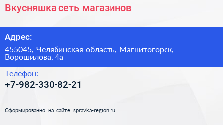 Вкусняшка, сеть магазинов по адресу 455045, Челябинская область, Магнитогорск, Ворошилова, 4а в дальнейшем Организация, размещена в следующих категориях: