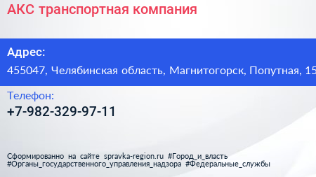 АКС, транспортная компания по адресу 455047, Челябинская область, Магнитогорск, Попутная, 15 в дальнейшем Организация, размещена в следующих категориях: