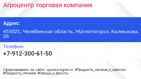 Агроцентр, торговая компания по адресу 455021, Челябинская область, Магнитогорск, Калмыкова, 26 в дальнейшем Организация, размещена в следующих категориях: