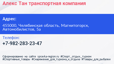 Алекс Тан, транспортная компания по адресу 455000, Челябинская область, Магнитогорск, Автомобилистов, 5а в дальнейшем Организация, размещена в следующих категориях: